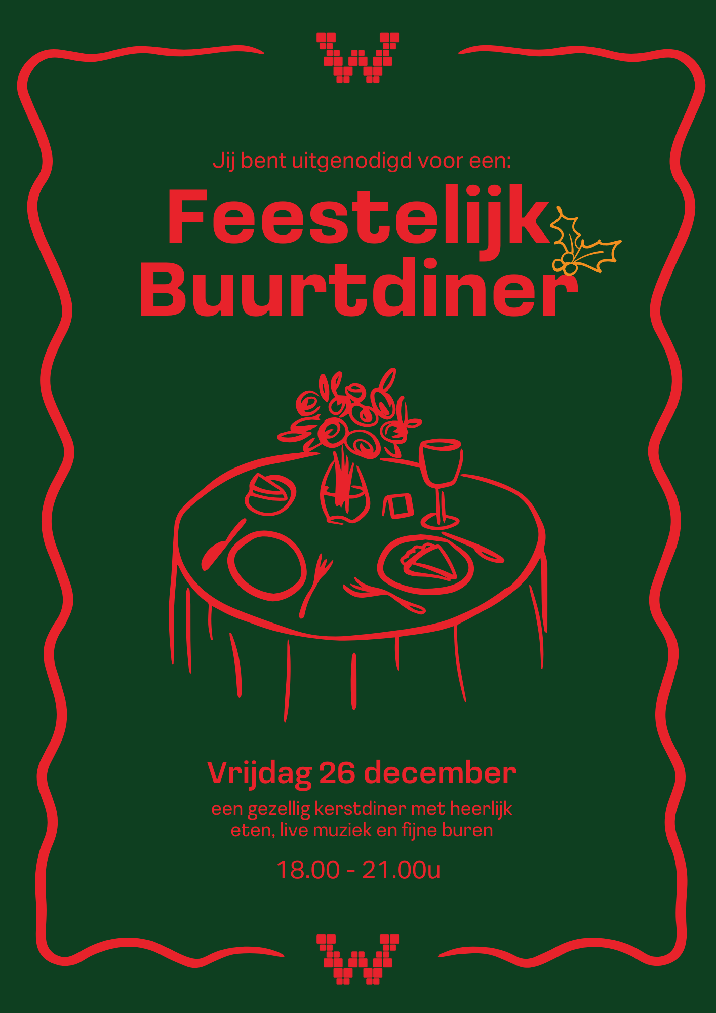 Kom op vrijdag 26 december naar het WijkPaleis in Weimar voor een gezellig kerstdiner met heerlijk eten, live muziek en fijne buren. Iedereen is welkom!
